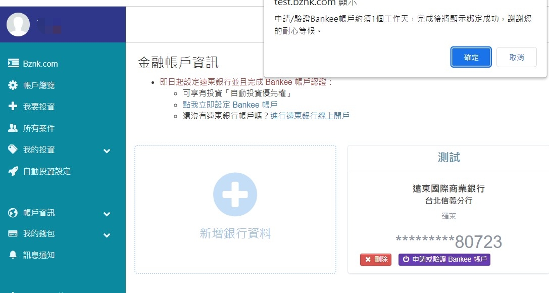 當您的開戶資料審核通過,系統便會自動新增綁定您的Bankee帳戶至平台,恭喜你升B等級成為 Bznk 投資人!