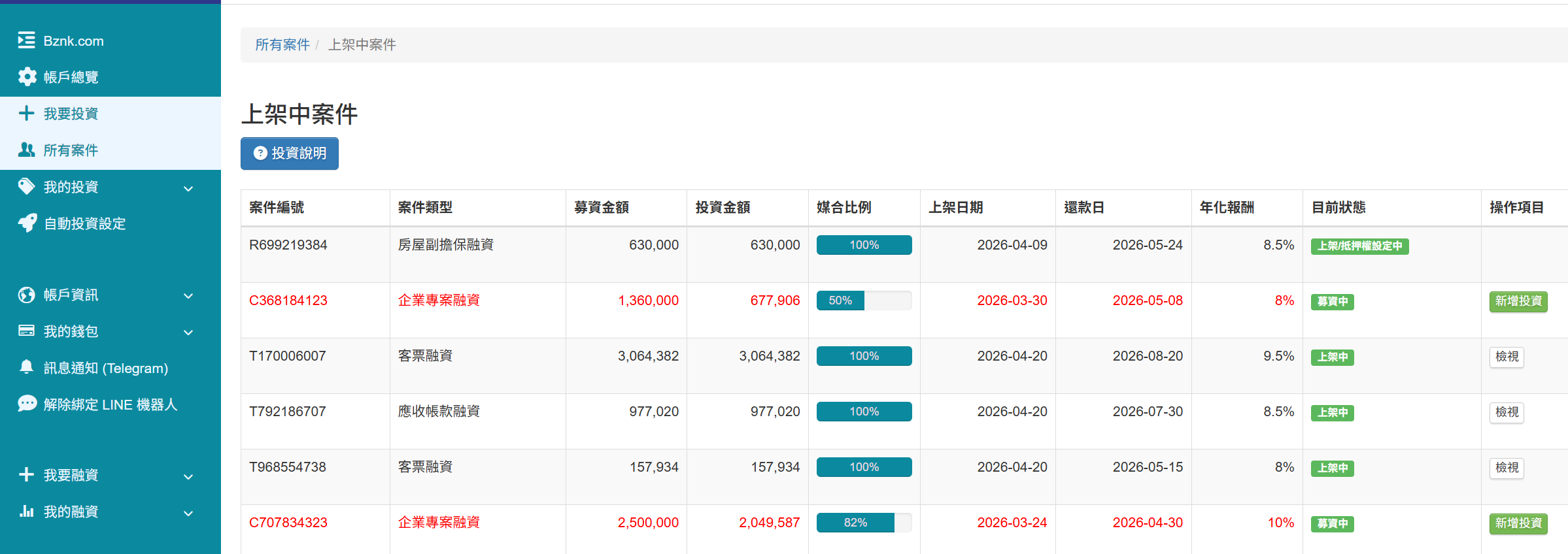 登入 Bznk 官網後,點選右上角的「我的帳號」,進入「我要投資」頁面即可查看目前上架中案件,媒合中可投資的案件,會顯示「新增投資」按鈕,可點選查看案件內容及新增投資。