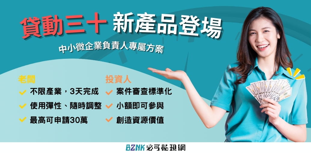 在景氣波動、訂單週期起伏的環境中,資金週轉速度往往決定了企業能否把握訂單與成長機會。Bznk必可推出全新專為中小微企業老闆們量身打造的快速信貸專案「貸動三十」,提供中小企業最高 30萬元的額度、24 期本息均攤,每月固定14,600元,核准後最快 3 個工作日撥款到帳,一起來看!