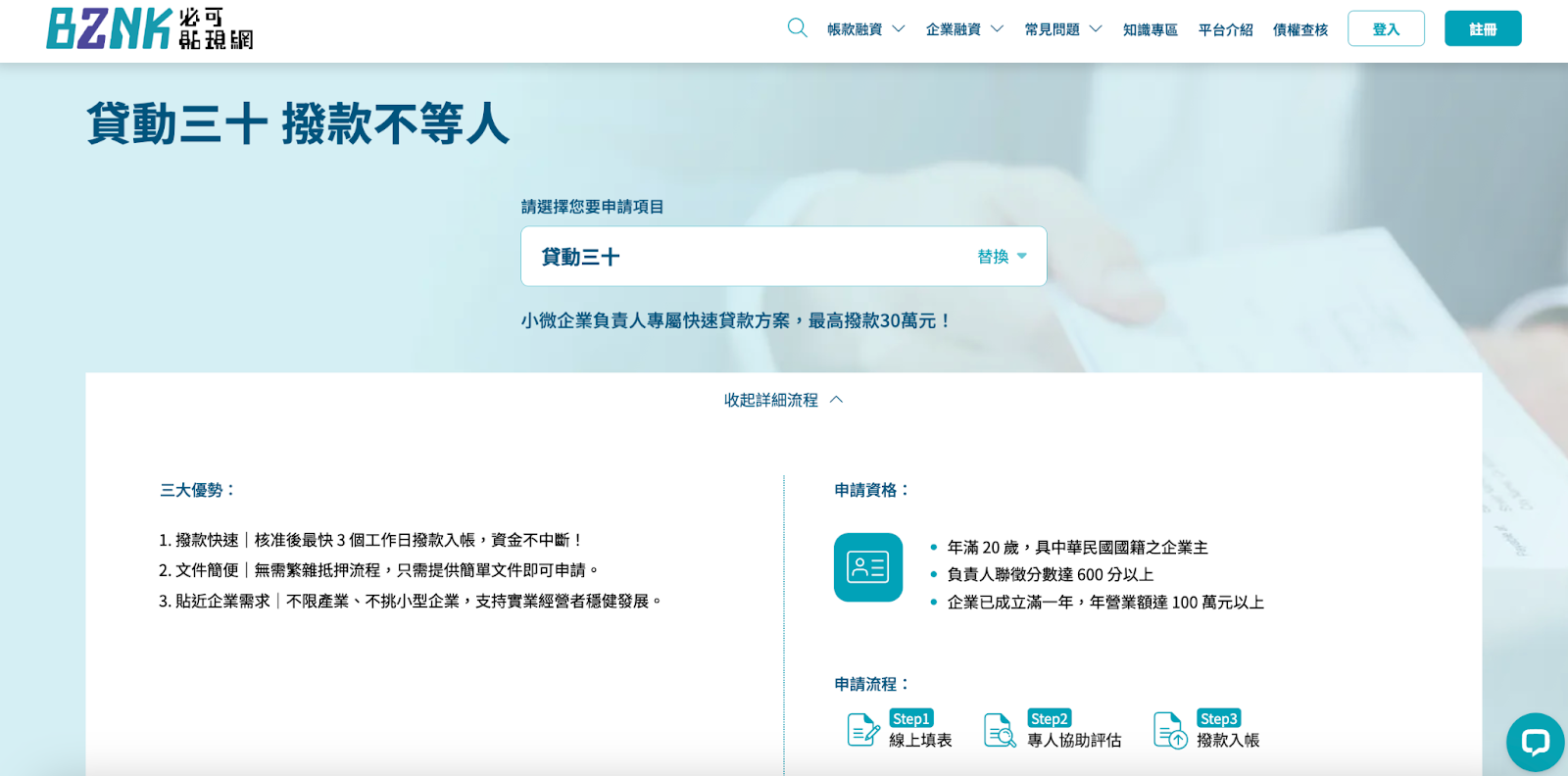 貸動三十是由 Bznk 必可貼現網推出的最新方案,訴求「貸動三十,三十天內靈活運用資金」,特別適合短期有現金流缺口的小微企業、個人工作室與創業團隊。透過平台的數據審核與信用建模,申請者可免去繁複的文件流程,只需提供基本營運資料、對帳明細或簡單財務資訊,即可線上送件、快速取得審核結果。