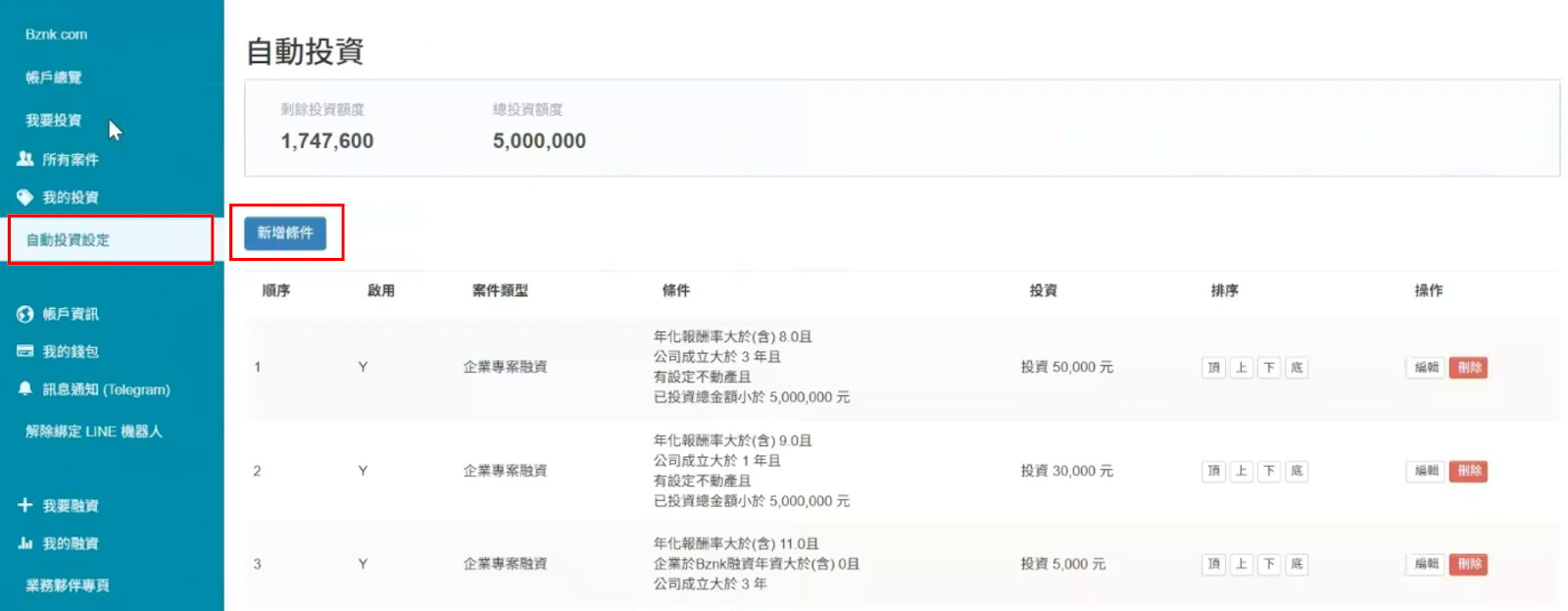 - 設定順位: 系統允許針對「每項產品最多設定 5 條規則」。系統會從順位 1 開始向下篩選,只要案件符合最先達到的條件,就會自動投資,但系統不會針對同一個案件重複投資。