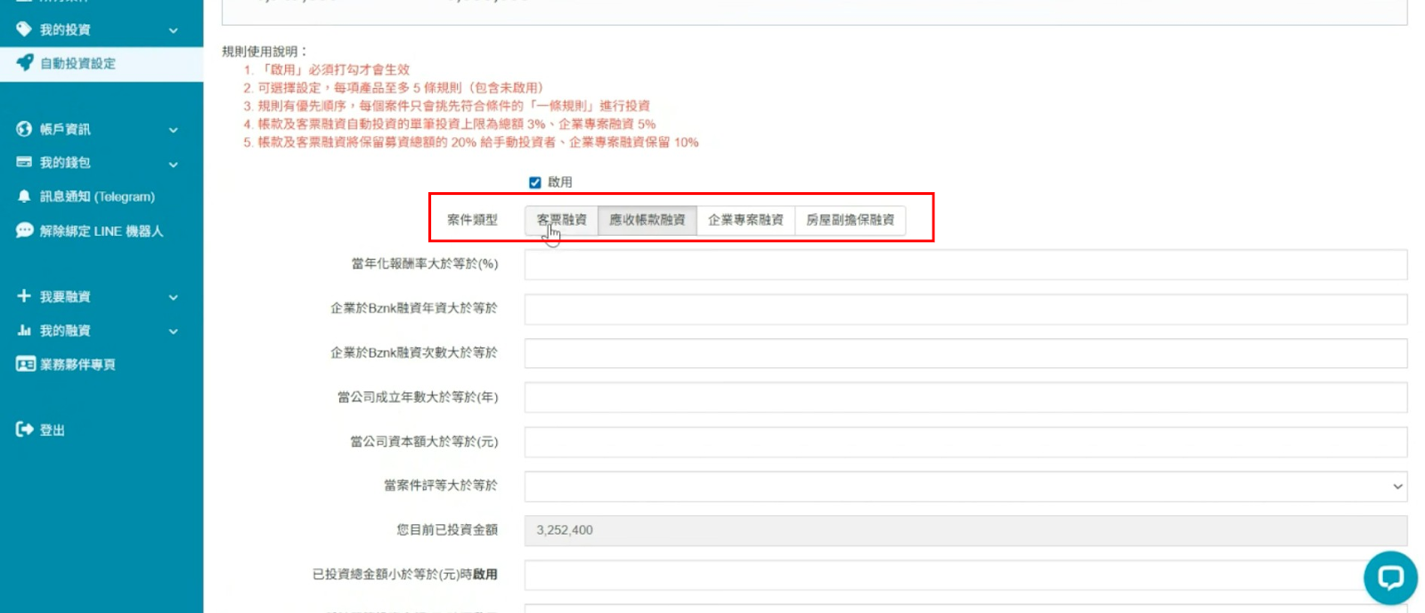 - 投資人可以針對不同的產品類別(如:帳款轉讓/票貼、企業專案融資等)分別建立專屬的自動投資規則。