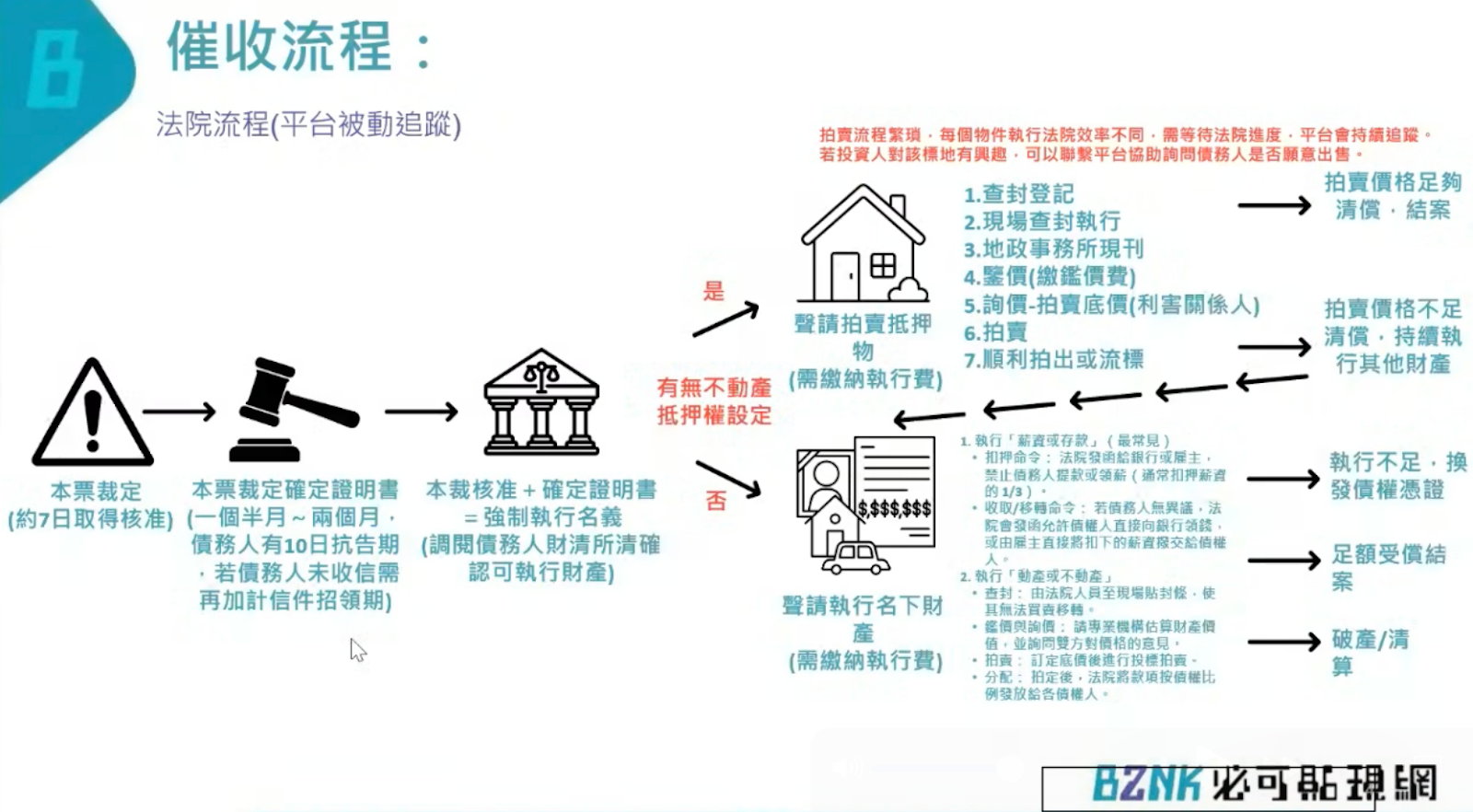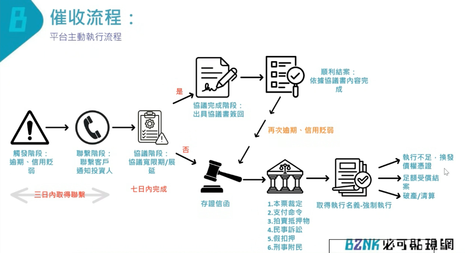 案件若發生預期,Bznk 有標準「平台主動執行」跟「法院流程(平台被動追蹤)」 SOP 流程,如下圖所示: