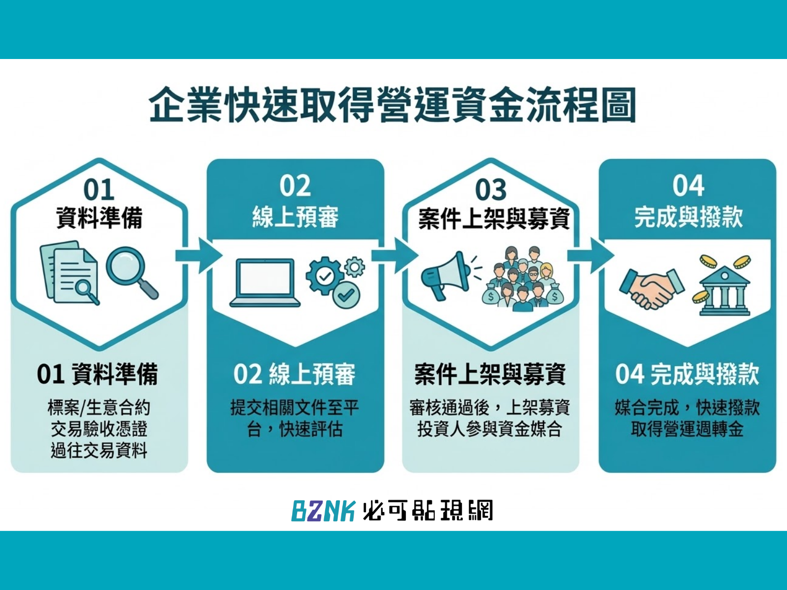 A:企業可透過金融科技平台進行初步評估,例如 Bznk 提供線上申請與專業服務,協助企業依標案合約與資金需求規劃融資方案,讓企業更快速取得營運資金。