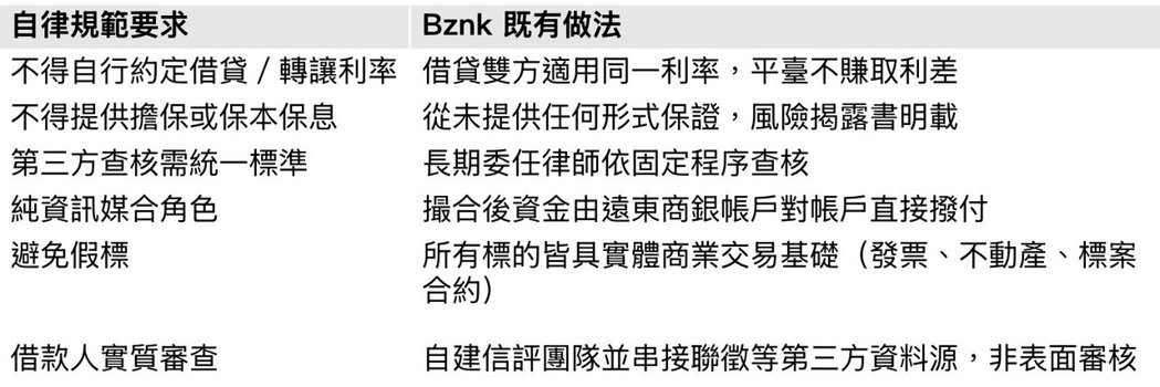 先前爆雷的 P2P 平臺,幾乎都逾越資訊媒合角色——自行約定利率、承諾保本保息、金流管理風險。Bznk 的商業模式從第一天起即與此切割: