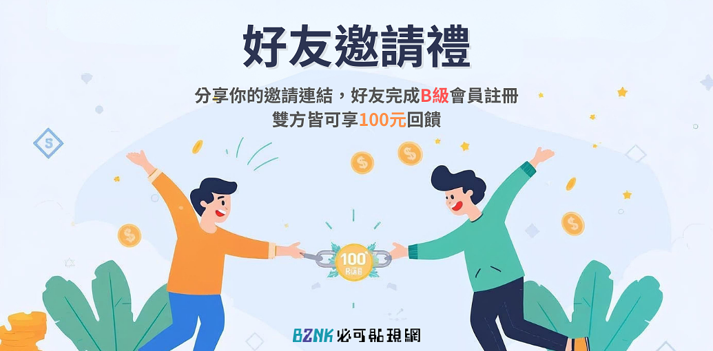 【新戶限定】註冊領取100回饋,邀請好友成為B級會員,雙方再享100元回饋!