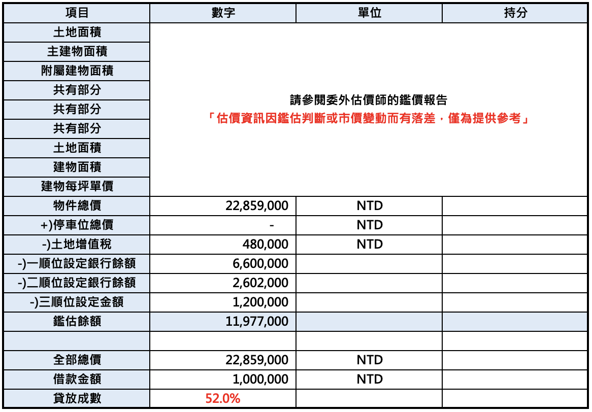 募資擔保 | 提供不動產設定450萬元為副擔保(要求撥款後清償三順位設定,估價報告中限制登記部分已自行塗銷)