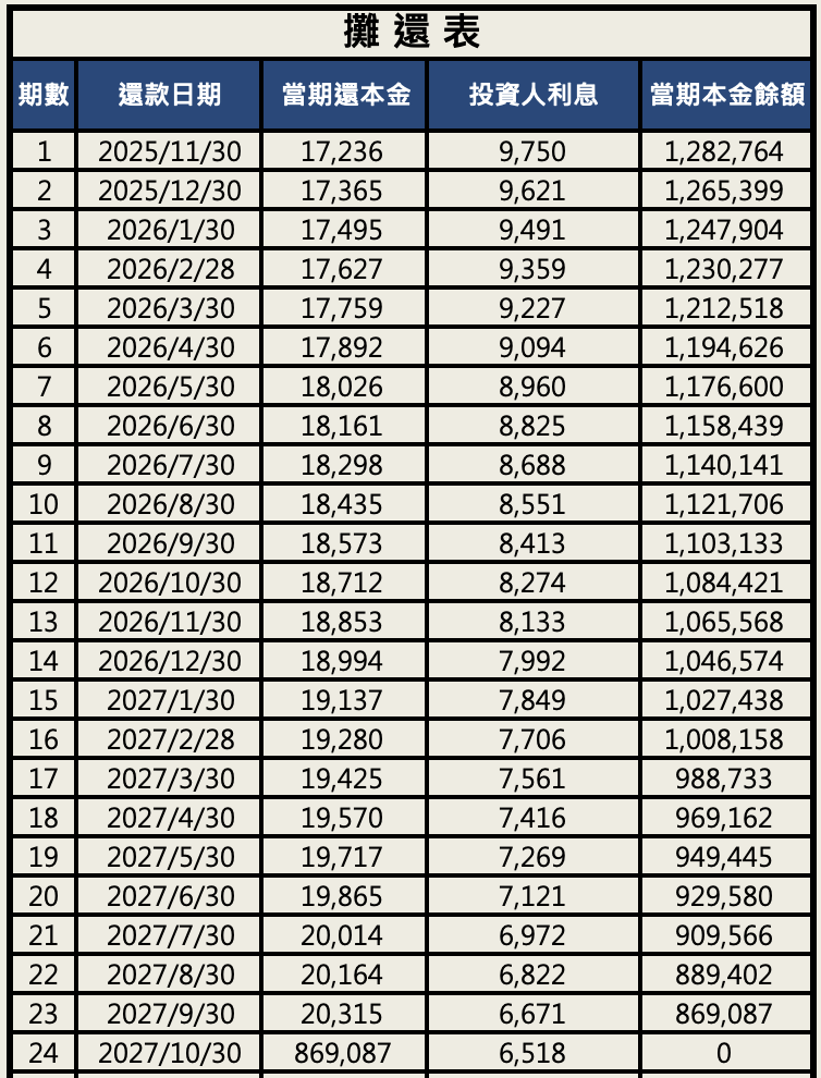募資金額: 1,300,000(該公司有提早償還本金權利)