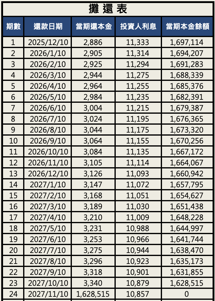 募資金額: 1,700,000(該公司有提早償還本金權利)
