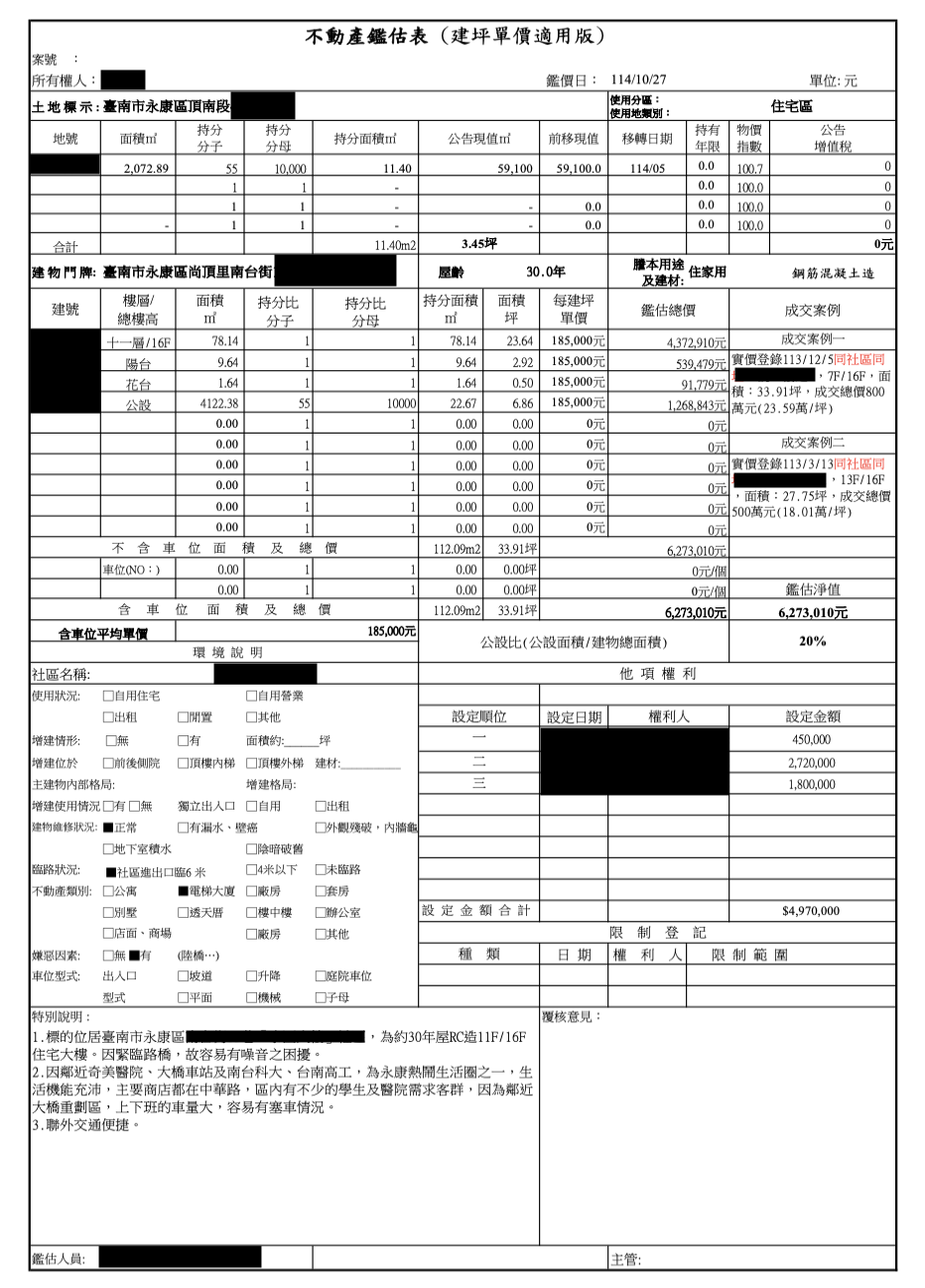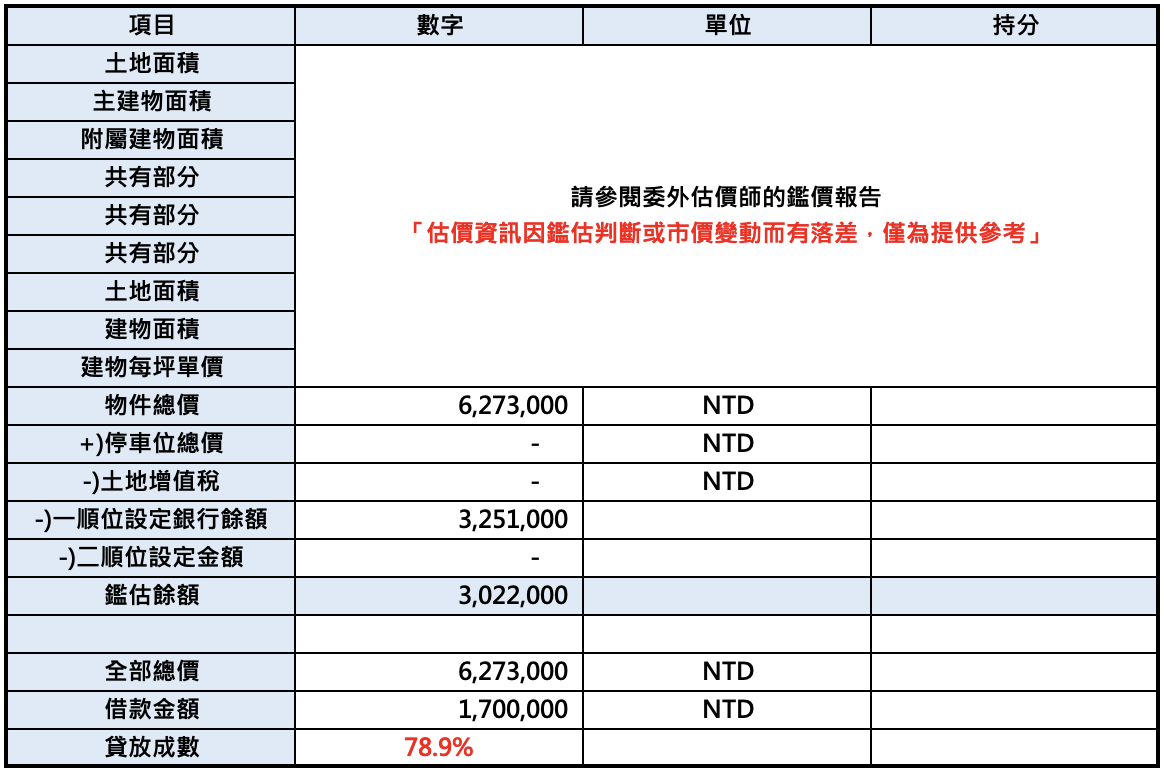 台南市永康區南台街電梯大廈 鑑估總額:627.3萬 (建物面積:33.91坪,土地面積:3.45坪) 前順位銀行餘額:325.1萬 副擔保抵押設定四順位金額:255萬(前三順位為同一銀行) 註:在部分案件Bznk僅為代理催收而非債權人,不動產仍有遭其他債權人扣押之風險,且以不動產的法拍賠償出借人仍須經法院催收程序透過法院強制執行程序進行,請您自行評估並承擔相關風險。