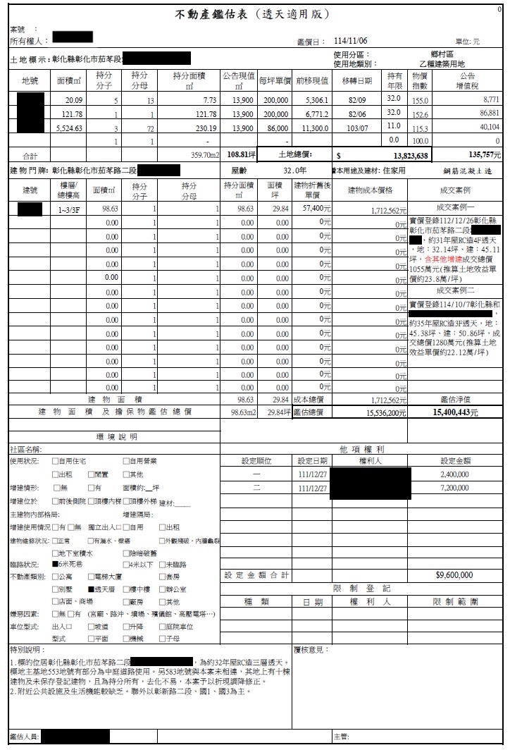 不動產副擔保資訊 彰化縣彰化市茄苳路透天厝 鑑估總額:1,553.6萬 (土地面積:108.81坪,建物面積:29.84坪) 一二順位銀行餘額:729.1萬(前二順位為同一銀行) 副擔保抵押設定三順位金額:600萬 註:不動產設定於平台因BZNK僅為代理催收而非債權人,仍有遭企業之其他債權人扣押之風險,且以不動產的法拍賠償出借人仍須經法院催收程序透過法院強制執行程序進行,請您自行評估並承擔相關風險。