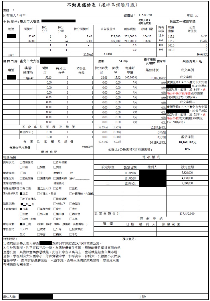 不動產副擔保資訊 臺北市大安區富陽街公寓 鑑估總額:1,018.9萬 (土地面積:6.2坪,建物面積:15.92坪) 一二順位銀行餘額:780.1萬(前二順位為同一銀行) 副擔保抵押設定三順位金額:750萬 註:不動產設定於平台因BZNK僅為代理催收而非債權人,仍有遭企業之其他債權人扣押之風險,且以不動產的法拍賠償出借人仍須經法院催收程序透過法院強制執行程序進行,請您自行評估並承擔相關風險。