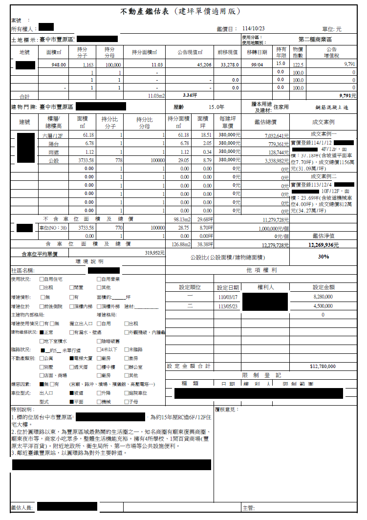不動產副擔保資訊 台中市豐原區中興路大廈 鑑估總額:1,227.9萬 (土地面積:3.34坪,建物面積:38.38坪-含一車位) 一順位銀行餘額:571.5萬 副擔保抵押設定二順位金額:750萬 註:不動產設定於平台因BZNK僅為代理催收而非債權人,仍有遭企業之其他債權人扣押之風險,且以不動產的法拍賠償出借人仍須經法院催收程序透過法院強制執行程序進行,請您自行評估並承擔相關風險。