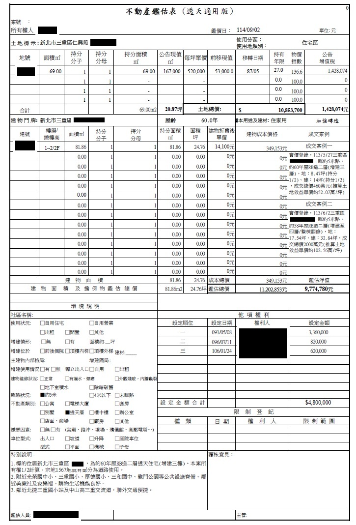 新北市三重區透天厝 鑑估總額:1120.2萬 (建物面積:24.76坪,土地面積:20.88坪) 一順位銀行餘額:152.9萬(前三順位同銀行) 副擔保抵押設定四順位金額:240萬 註:不動產設定於平台因BZNK僅為代理催收而非債權人,仍有遭企業之其他債權人扣押之風險,且以不動產的法拍賠償出借人仍須經法院催收程序透過法院強制執行程序進行,請您自行評估並承擔相關風險。