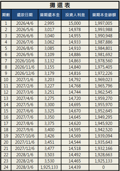 募資金額: 2,000,000(該公司有提早償還本金權利)