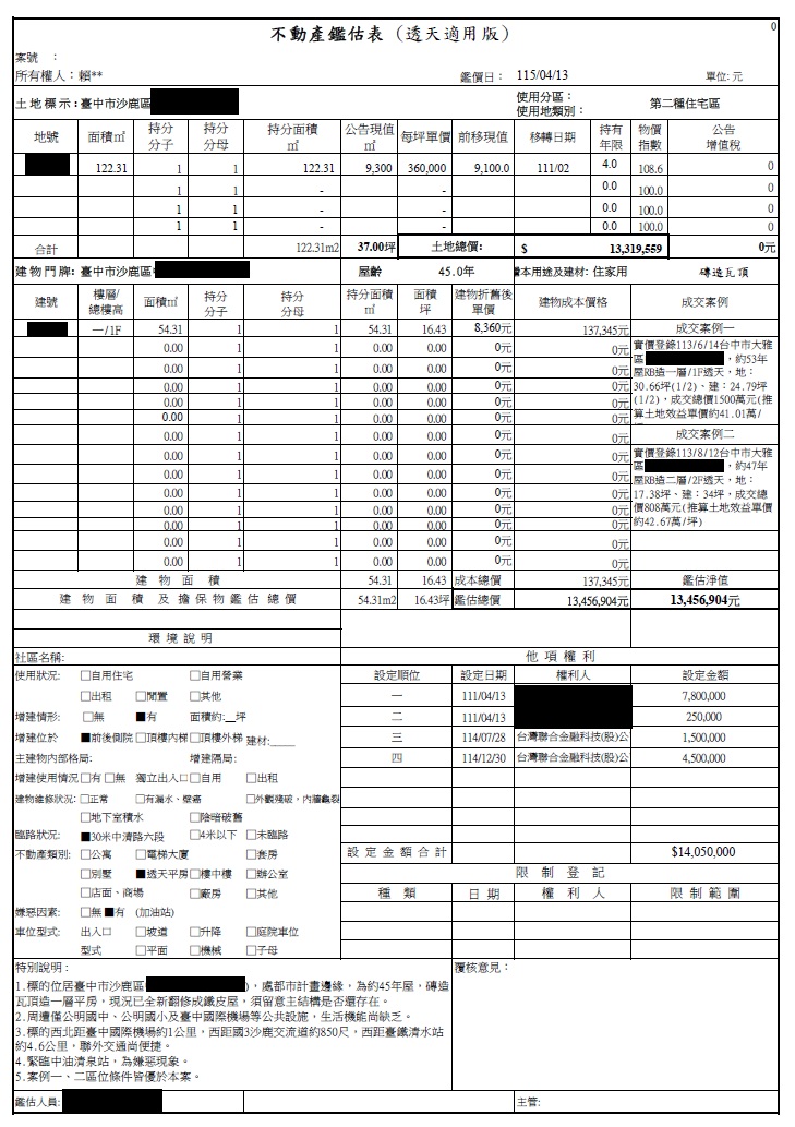 台中市沙鹿區中清路六段透天厝 鑑估總額:1,345.6萬 (土地面積:37坪,建物面積:16.43坪) 副擔保抵押設定三四順位金額:600萬(前二順位為同銀行) 註:不動產設定於平台因Bznk僅為代理催收而非債權人,仍有遭企業之其他債權人扣押之風險,且以不動產的法拍賠償出借人仍須經法院催收程序透過法院強制執行程序進行,請您自行評估並承擔相關風險。