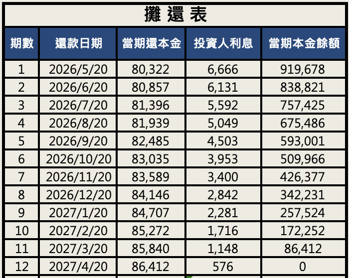 *借款總額新台幣 100 萬元,依年利率8%、按月攤還本息,本金到期清償。