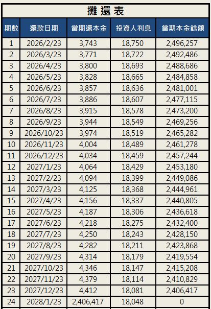 *借款總額新台幣 250萬元,依年利率 9 %、按月部分攤還本息,剩餘本金到期清償。