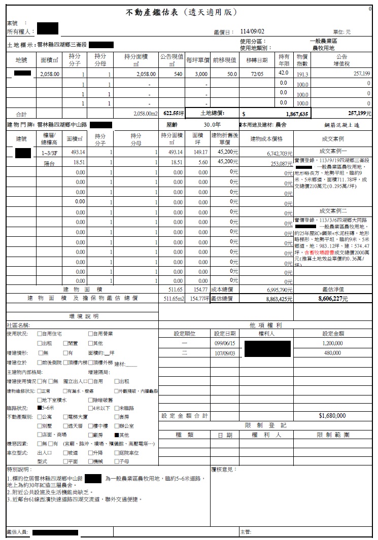 不動產副擔保資訊 雲林縣四湖鄉中山路農舍 鑑估總額:886.3萬 (建物面積:154.77坪,土地面積:622.55坪) 一順位銀行餘額:18.3萬(前二順位同銀行) 副擔保抵押設定三順位金額:375萬 註:不動產設定於平台因BZNK僅為代理催收而非債權人,仍有遭企業之其他債權人扣押之風險,且以不動產的法拍賠償出借人仍須經法院催收程序透過法院強制執行程序進行,請您自行評估並承擔相關風險。