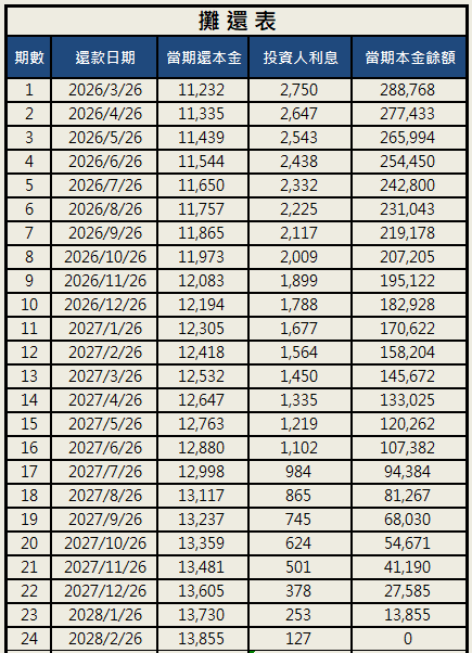 *借款總額新台幣 30 萬元,依年利率11%、按月攤還本息,本金到期清償。