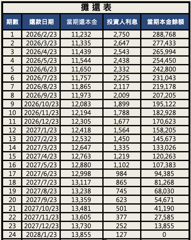 募資金額: 300,000(該公司有提早償還本金權利)
