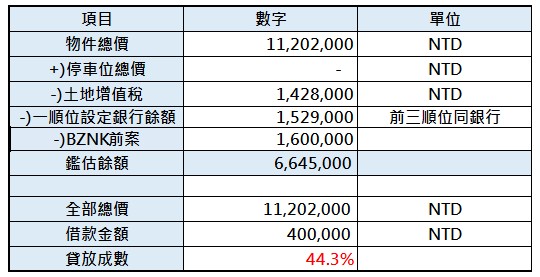 貸放成數:44.25%【[40萬+前案160萬+一順位銀行餘額152.9萬+土增142.8萬/1120.2萬】