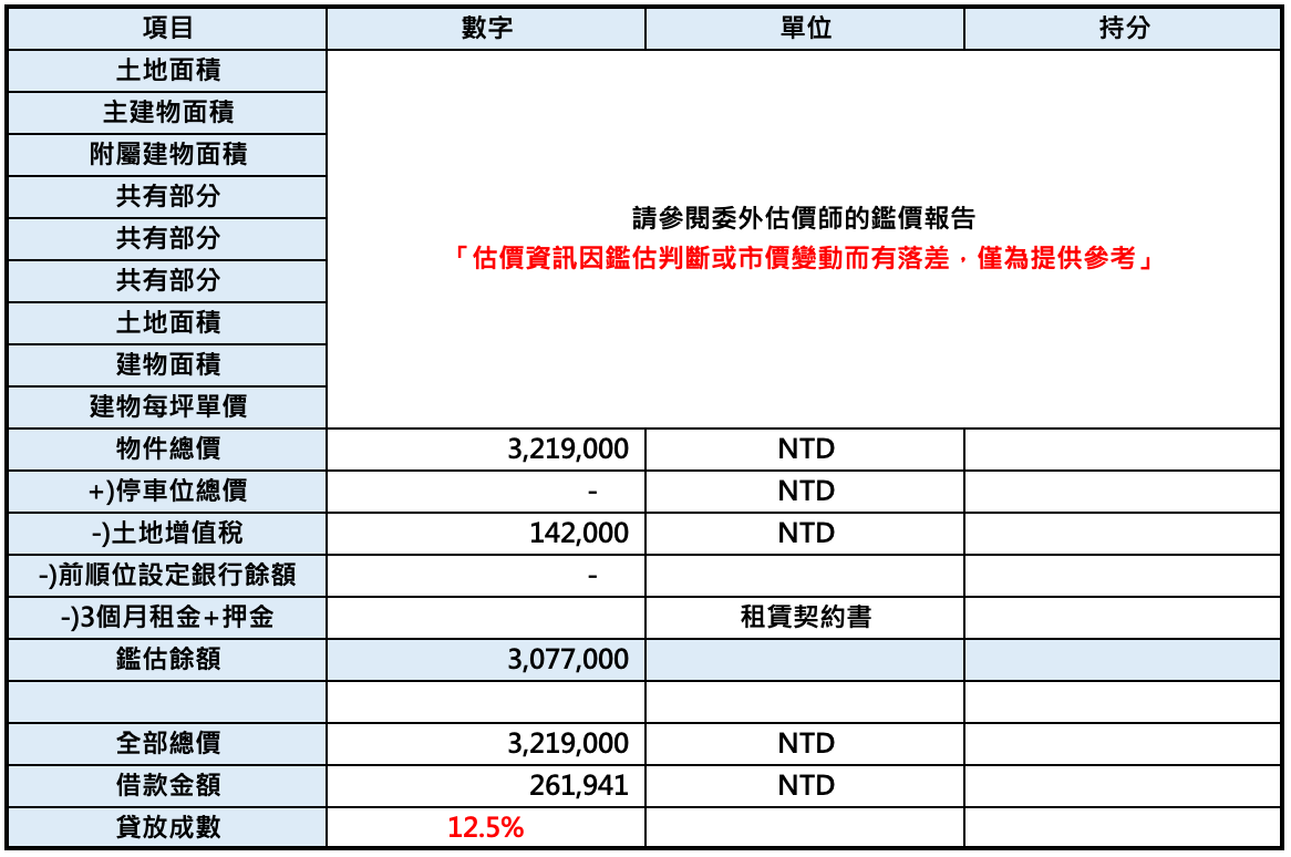 貸放成數:12.55% 【(261,941+土增14.2萬)/321.9萬】