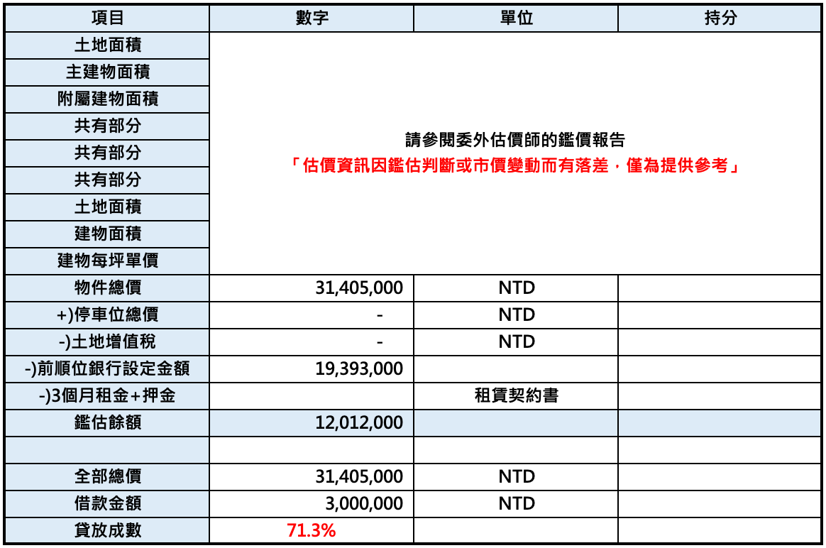 貸放成數:71.30%【[300萬+前順位銀行餘額1,939.3萬+土增0萬/3140.5萬】
