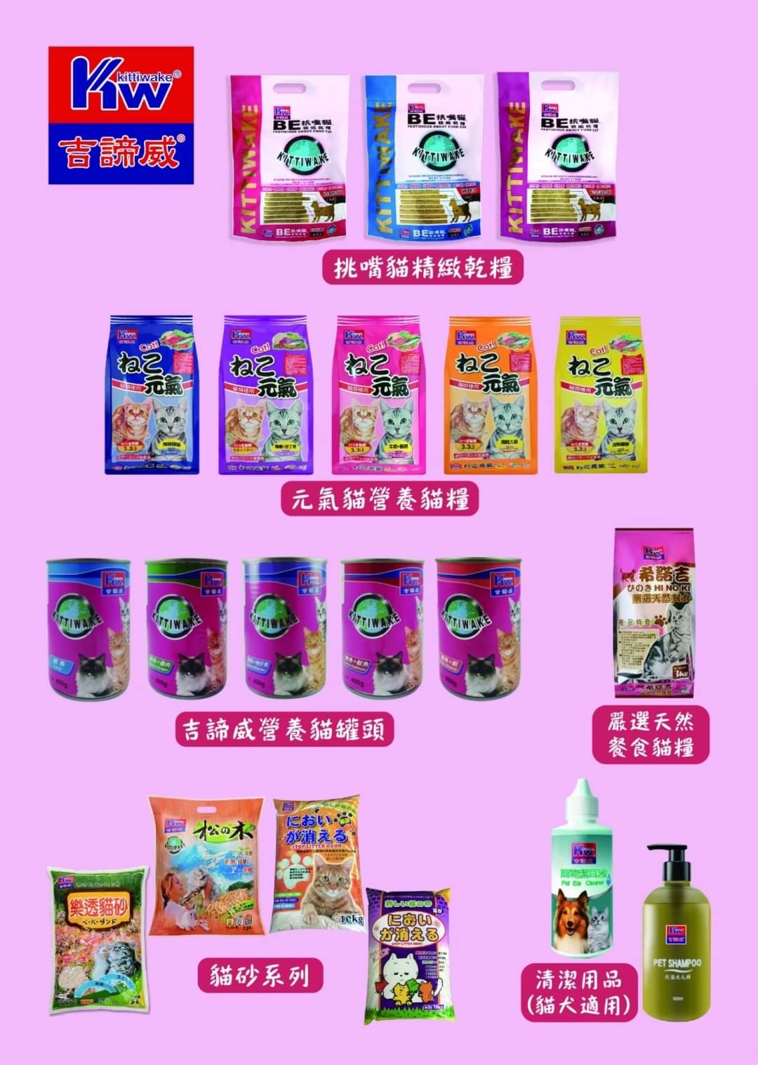 KW吉諦威及希諾吉HI NO KI 寵物系列食品、元氣貓營養乾糧系列、挑嘴猫精緻貓乾糧系列、希諾吉嚴選天然貓餐食、挑嘴狗精緻狗乾糧系列、比賽犬專用犬糧、希諾吉高品質嚴選狗乾糧、吉諦威營養狗乾糧、元氣DOG 狗乾糧系列、希諾吉嚴選天然狗餐食、吉諦威營養狗罐頭、希諾吉嚴選犬用餐盒、亞洲炭元素犬貓專用洗毛精、吉諦威抗菌潔耳液、抗菌護髮洗毛精各式貓砂 。